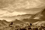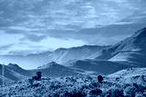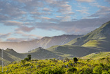 Mountain, clouds and sunset landscape with field, blue sky and calm hill for travel location. Nature, fog and sustainable environment with earth, peace and holiday destination with conservation