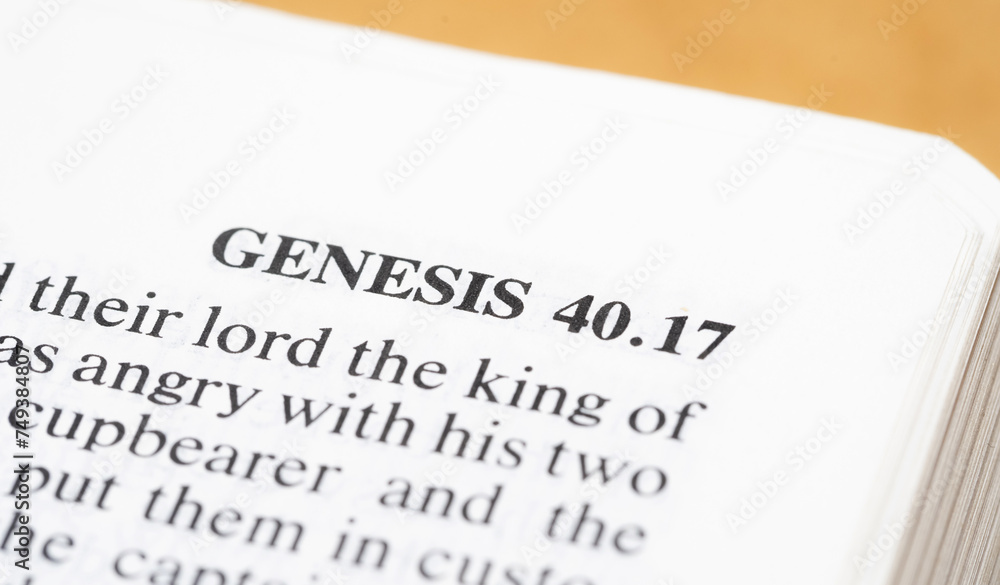 A close-up view capturing the text of Genesis 40;17 on a page within an open Bible, closeup, old testament books. Holy Bible christian catholic religious book simple concept. Creationism, Adam and Eve