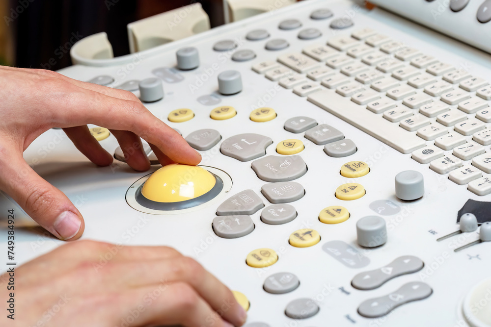 A close-up snapshot capturing the precise moment a doctors hand engaging with the controls of a modern ultrasound machine during a medical examination Professional equipment training education concept