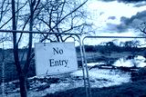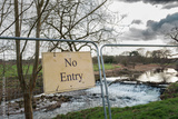 No Entry sign attached to a metal fence at the site of a flooding river in the UK. Seen after heavy storms. The river is wild and deep with a risk to safety.