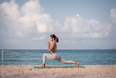 Young sport woman wearing sport suit practice yoga on the beach .Yoga is meditation and healthy sport relaxing on summer holiday with blue sea and sky background.