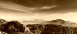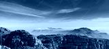 Mountain, clouds and blue sky with horizon, natural landscape and calm cliff at travel location. Nature, fog and sustainable environment with earth, peace and holiday destination at tropical island