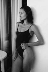 gorgeous slim tanned woman with perfect body in black bodysuit posing at sunset . girl model posing in sunlight. posing model