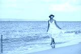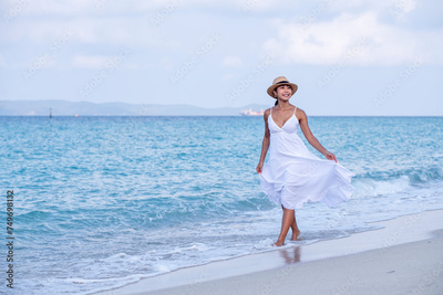 Happy sexy Asian traveller woman wear white beach dress and hat show enjoys on tropical beach vacation in summer holidays
