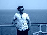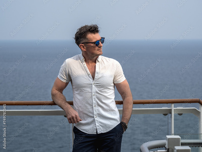 Handsome man standing on the empty deck of a cruise liner against the backdrop of sea waves. Sunny, clear day. Closeup, outdoor. Vacation and travel concept
