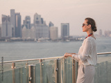 Cute woman standing on the empty deck of a cruise liner against the background of the city of Doha. Sunny morning, clear day. Closeup, outdoor. Vacation and travel concept