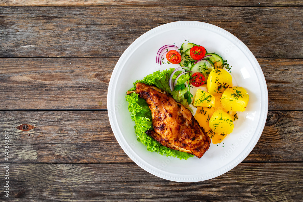 Cooked rabbit thighs with potatoes and fresh vegetable salad on wooden table