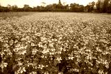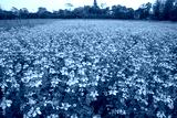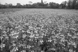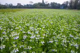 Blooming White Nigella sativa flowers in the field with blue sky. Natural Landscape view