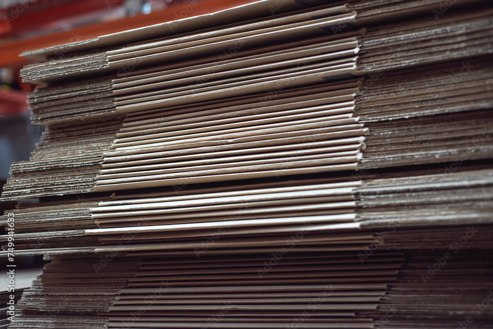 Stack of folded moving boxes cardboard case brown beige packaging for sale at hardware improvement store, brand new corrugated sheets polyester strap tied, Dallas, TX, polygraphic background