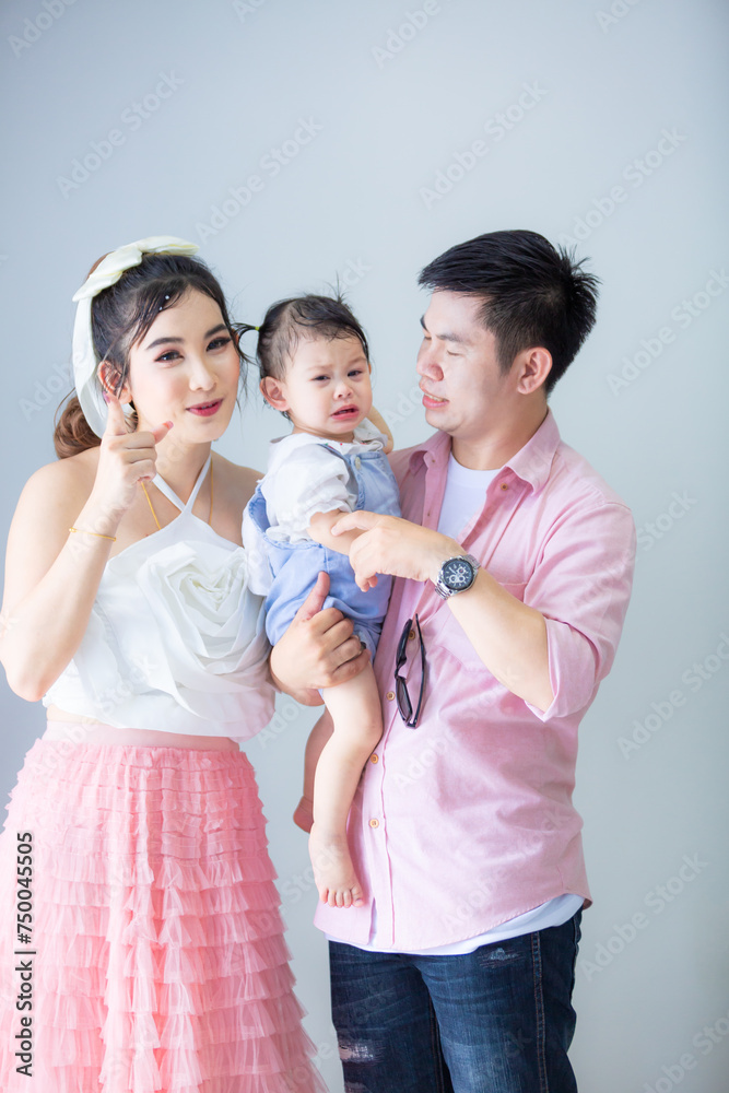 Parents and sweet little daughter,SFather, mother and daughter isolated background,Asian parents and daughter isolated background
