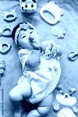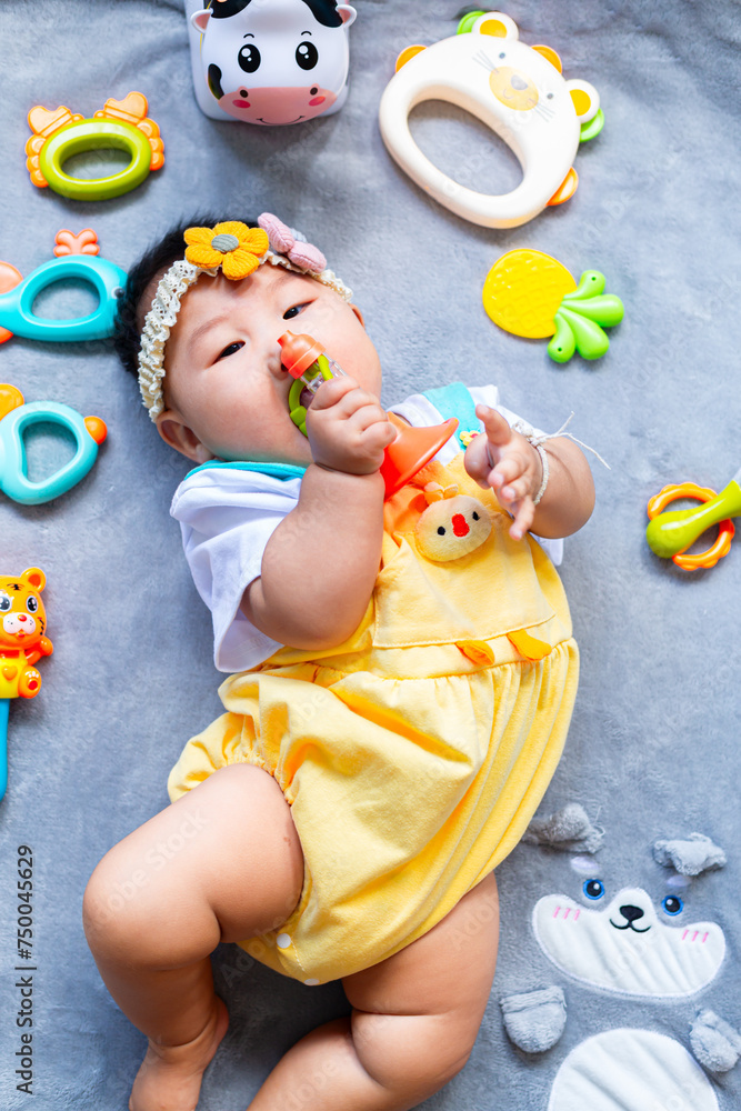 Baby in cute outfit with toys,Little girl 3-6 months old in cute outfits