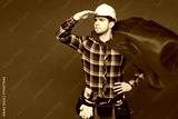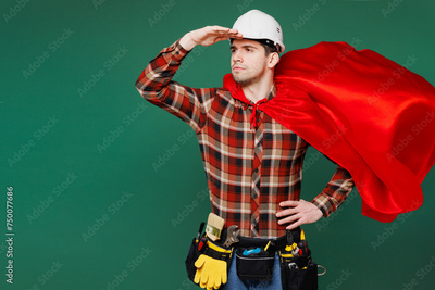 Young employee laborer man wear red shirt hardhat hat super hero costume work look far away isolated on plain green background. Instruments accessories renovation apartment room. Repair home concept.