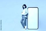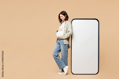 Full body smiling young pregnant woman future mom wears grey shirt with belly stomach tummy with baby big blank screen mobile cell phone isolated on plain beige background. Maternity family concept.
