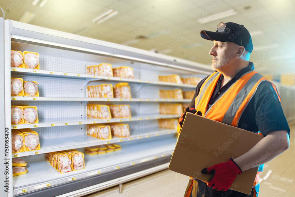 Man merchandiser. Supermarket loader. Guy with box near shelves in grocery store. Merchandiser fills supermarket shelves. Man works in grocery store. Merchandiser in reflective vest