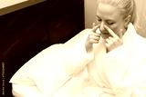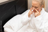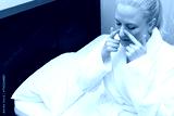 White Woman Applies Nasal Strip on Nose Before Going To Bed, Sitting on Bed. Stop Drug-free, Snoring, Sleeping Apnea Solution. Copy Space. Adhesive Bandage For Better Healthy Breathing. Horizontal.