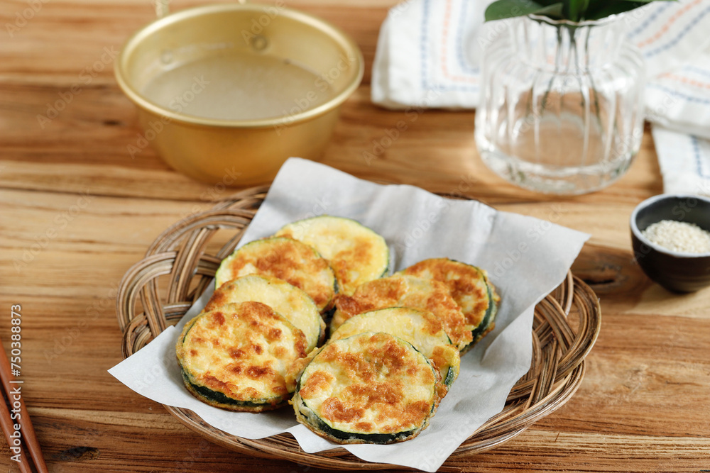 Hobak Jeon or Pan Fried Zucchini served with Makgeolli