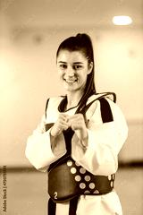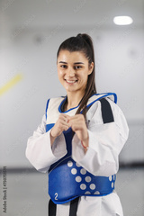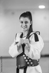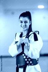 Portrait of a happy taekwondo girl in dobok in strike position at martial art school.