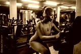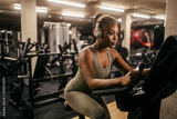 A fit black sportswoman with headphones practicing on bicycle at gym.