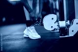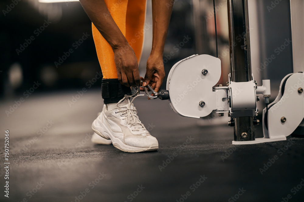 Close up of a black sportswoman's hands adjusting dual pulley machine on her leg.