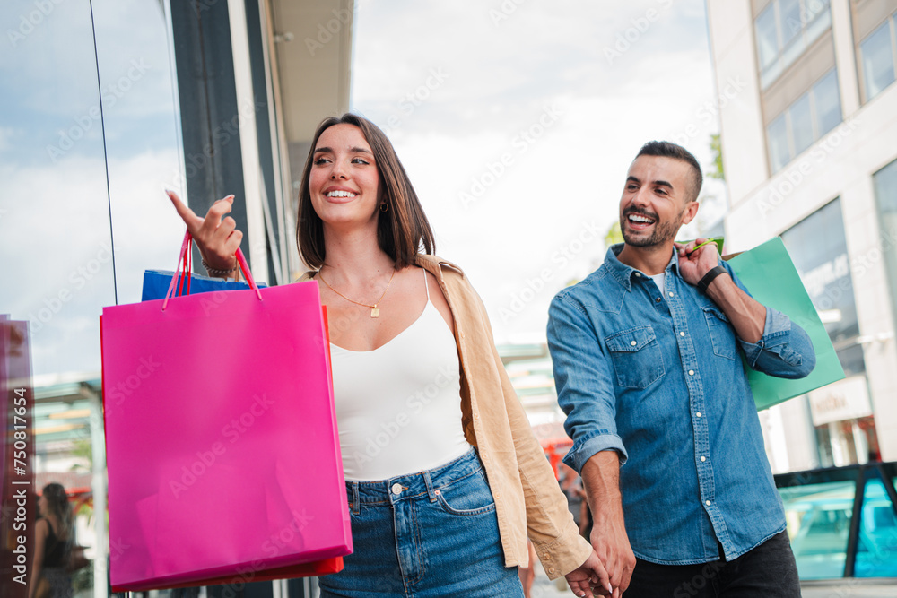Pretty woman with shopping bags pointing a store showcase, walking on a mall with her boyfriend. Happy young couple enjoying a sale day together, watching for retails, promotions and discounts