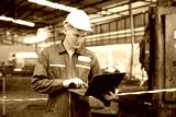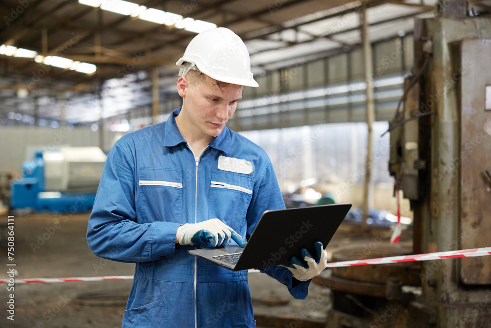 technician or engineer working on laptop computer in the factory