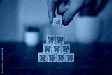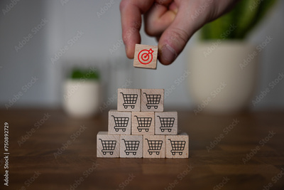 Sale volume increase make business goal success, Wood cube with icon goal and shopping cart symbol.