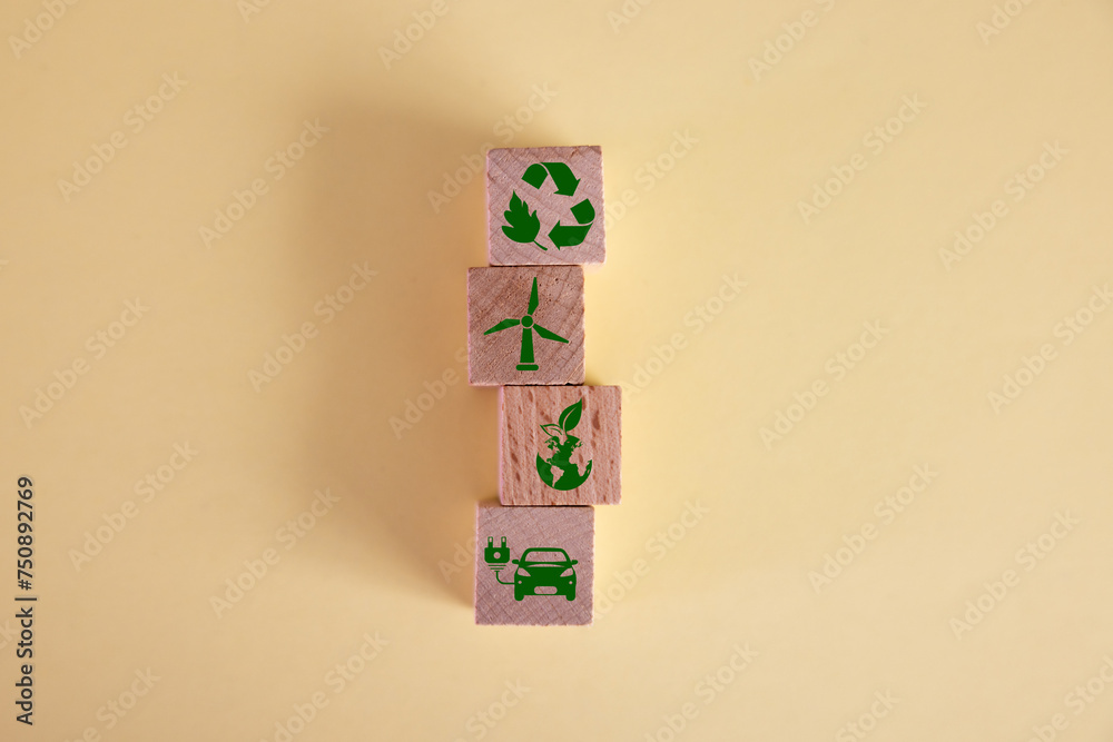 Stack wood cube block, global warming and climate change, offset by planting tree. Net zero greenhouse gas emissions target. Climate neutral long term strategy environment.