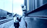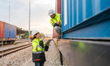 Team of engineer railway wearing safety uniform and helmet under checking train ,wheels and control system for safety transportation. Maintenance cycle concept.
