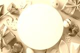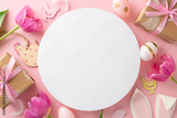 Easter happiness motif: Top view of vivid eggs, cute wooden chick decorations, kraft gift boxes with bows, playful bunny ears, and fresh tulips on pastel pink backdrop, round space reserved for words