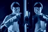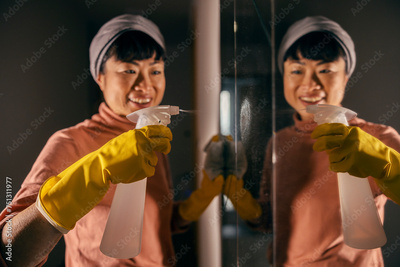 A tidy japanese woman is spraying detergent on mirror and cleaning it.