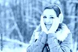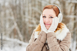 Humeral portrait of red-haired girl in earmuffs, clasping face with her hands in white knitted gloves