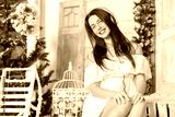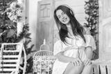 Portrait of young woman sitting on threshold of fake home and listening music in headphone, smiling and look at us. Christmas interior studio, close-up