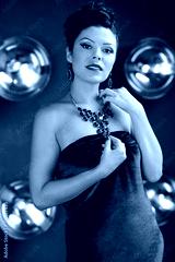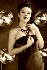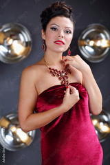 Beautiful woman poses in red dress near wall with lamps in grey studio