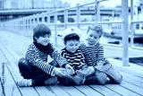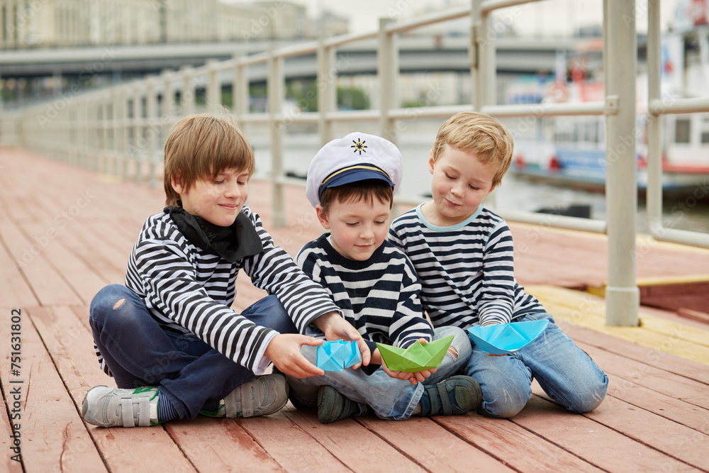 Three boys in striped vests play with paper boats sitting on wooden part of embankment