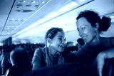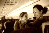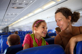 Mother and daughter smiling at each other on an airplane
