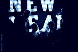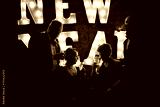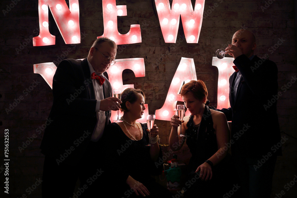 Four happy friends drink white wine near illuminated letters (New Year) in dark studio