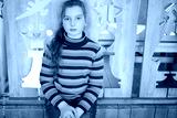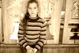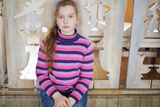 Beautiful girl sits near carved wooden fence indoor and looks at camera