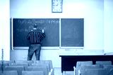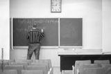 Teacher writes formulas of quantum theory of light on blackboard in classroom, back view