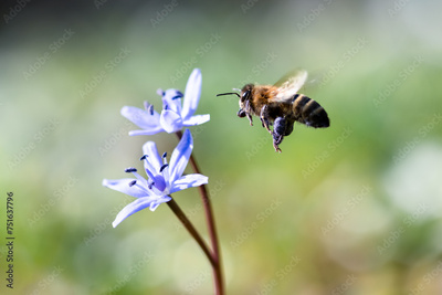 A flying working bee collecting pollen from blue wildflower on spring meadow. Macro photography