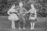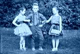 Boy in red trousers and blue shirt stands with two girls at grassy lawn