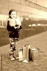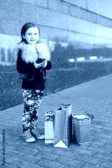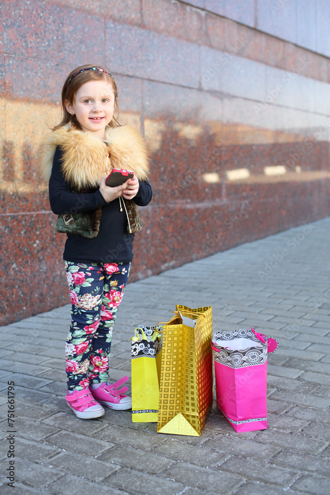 Happy little girl with pink phone and shopping bags