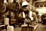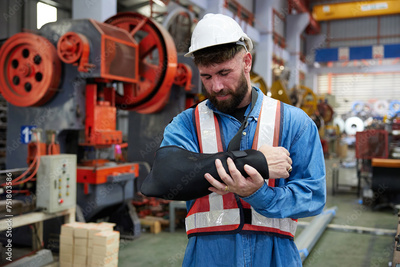 worker or engineer wearing bandages splint, pain in elbow and ache in arm from hard work in the factory