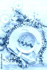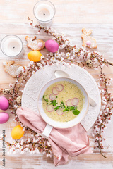 Vegetable soup with zucchini, cauliflower and radish for Easter with colorful eggs