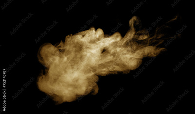 Brown-black dust powder explosion. The texture is an abstract concept. and splashes float. on a black background