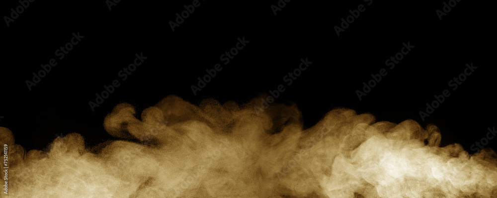 Brown-black dust powder explosion. The texture is an abstract concept. and splashes float. on a black background