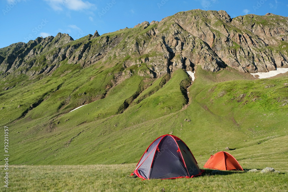 landscape with touristic tents in green big mountains and blue sky, nature background. trip, journey, hiking, adventure concept. summer season in Caucasus mountains, Karachay-Cherkess Republic. Arkhyz