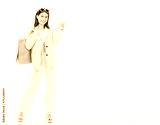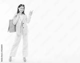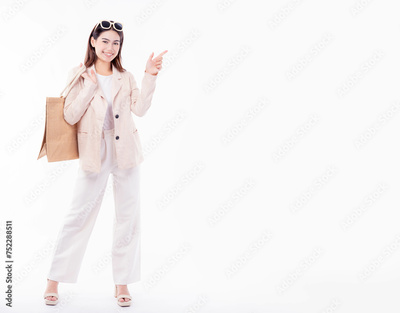 Young Asian business woman pointing up to copy space and looking at camera with smile face and happy Pretty girl act like a satisfied product, use for advertising with isolated on white background