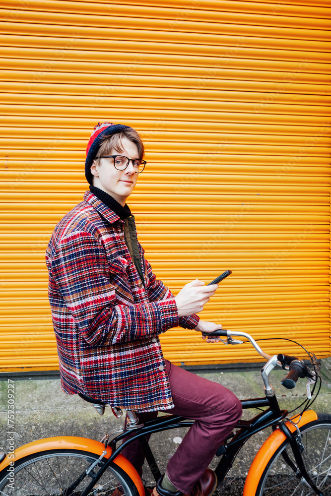 Young hipster man using mobile phone while sitting on city bicycle near orange wall. Student using 5g network,rests after riding. Eco friendly transport for carbon footprint. Sustainable lifestyle
