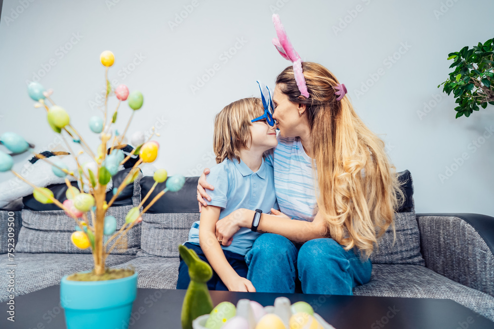 Happy smiling Caucasian mother and her son in bunny ears having fun at home on Easter day. Family sitting on sofa at home hugging, mother kissing son. Family Easter traditions. Selective focus