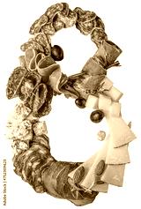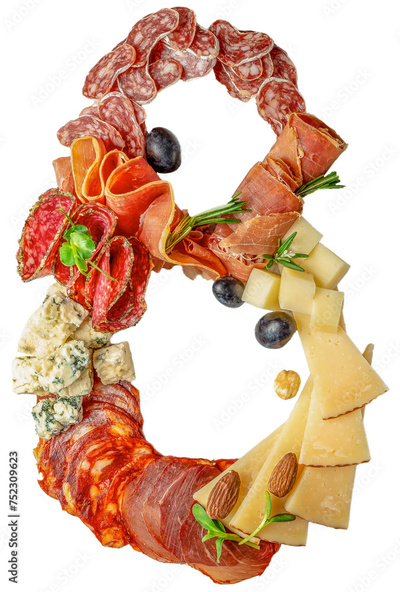 Italian appetizers or antipasto set with gourmet food isolated on white background. Mixed cheese and meat snacks of the number eight. International Women's Day